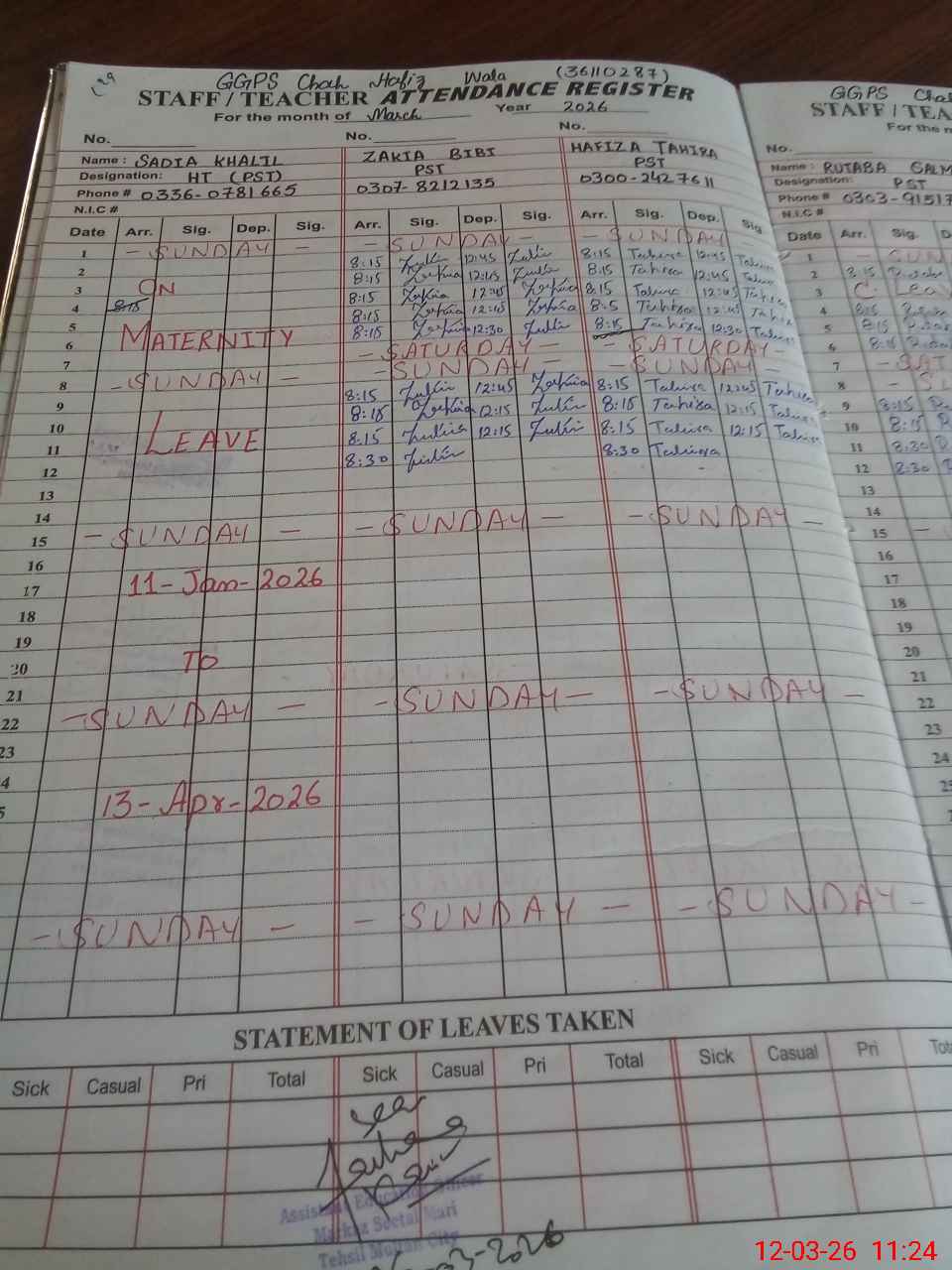 | 36**** | Sa**** Kh**** | PST Science/Maths | Regular | 0 | 0 | 0 | 0 | 0 | 0 | 0 | 0 | 0 | Maternity |