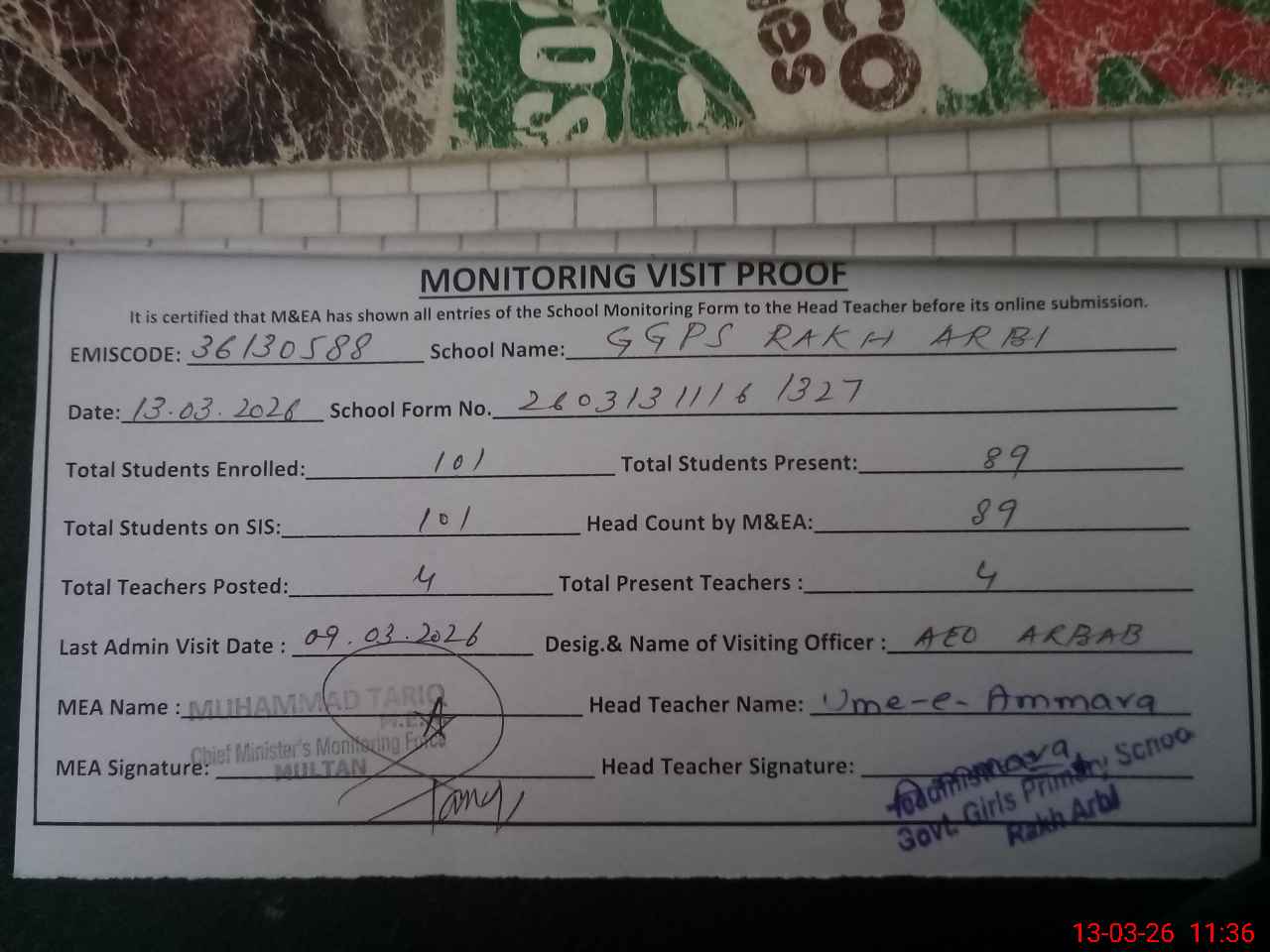 | Attendance Register | Head Teacher | MEA with School | Visit Proof |