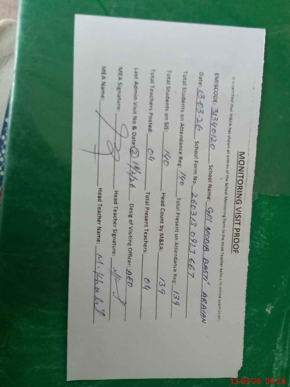 | Attendance Register | Head Teacher | MEA with School | Visit Proof |