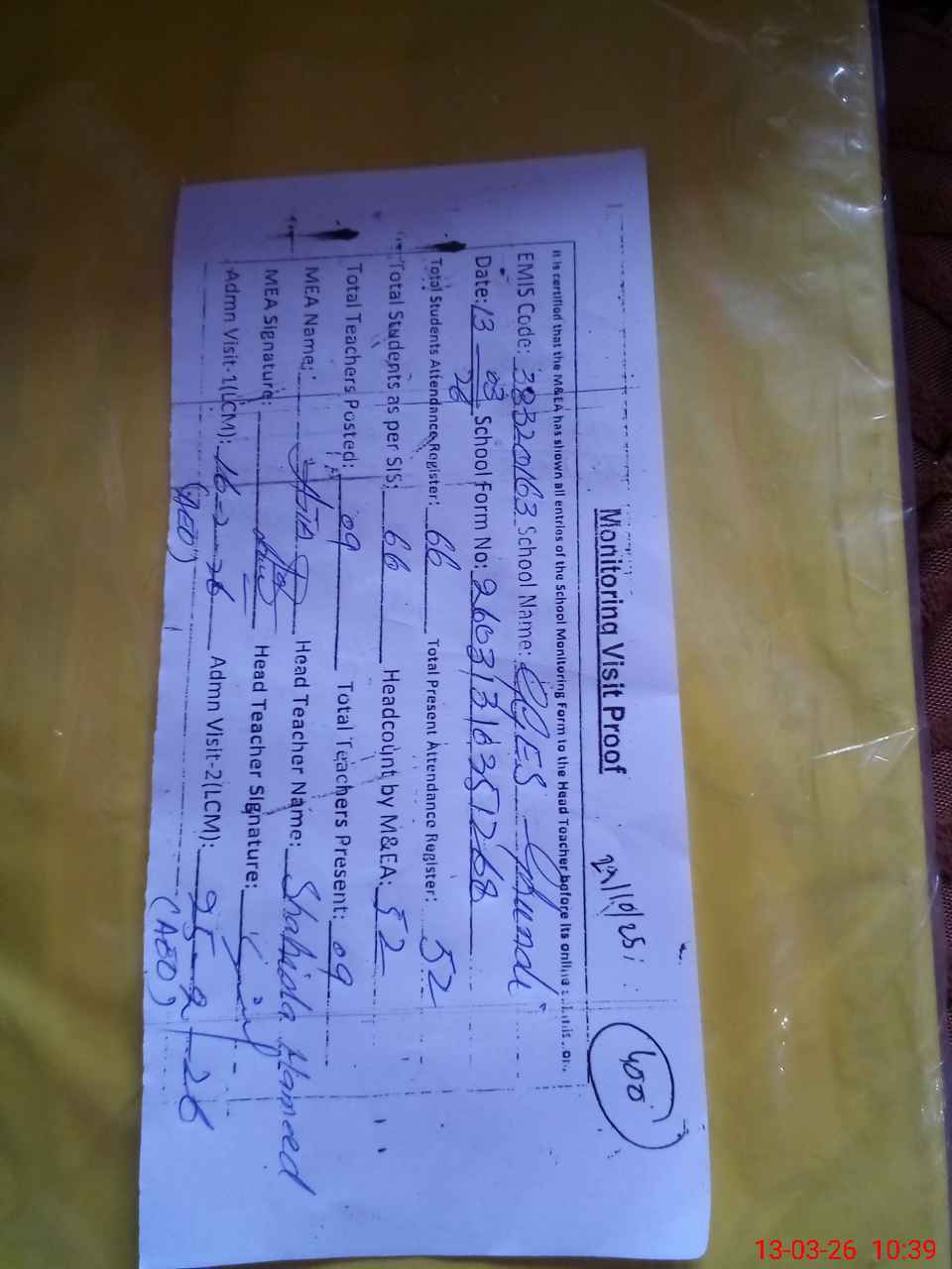 | Certified that this School was Inspected by the Undersigned MEA/DMO Today and the Information Stated Above is as Per Record. | |||||