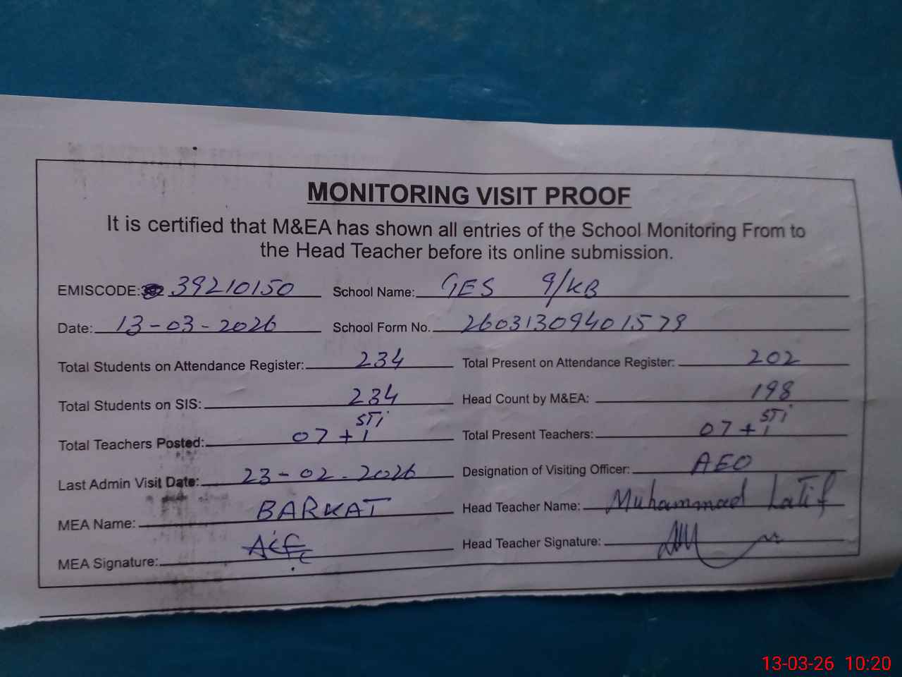 | Remarks (Use Separate Page if Required): No SBA of class 7 today STI Kashif Munir is present in this school | |||||