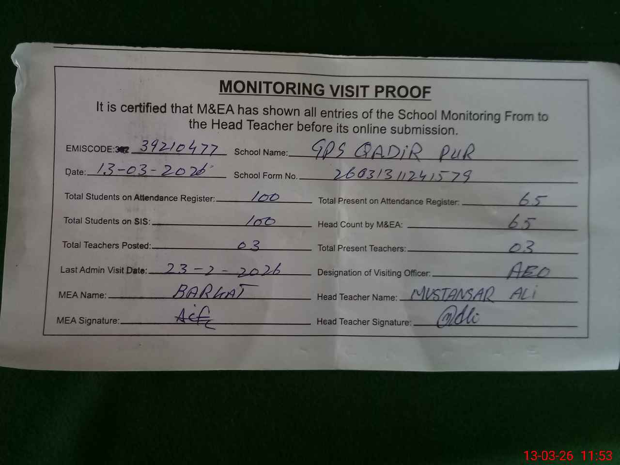 | Attendance Register | Head Teacher | MEA with School | Visit Proof |