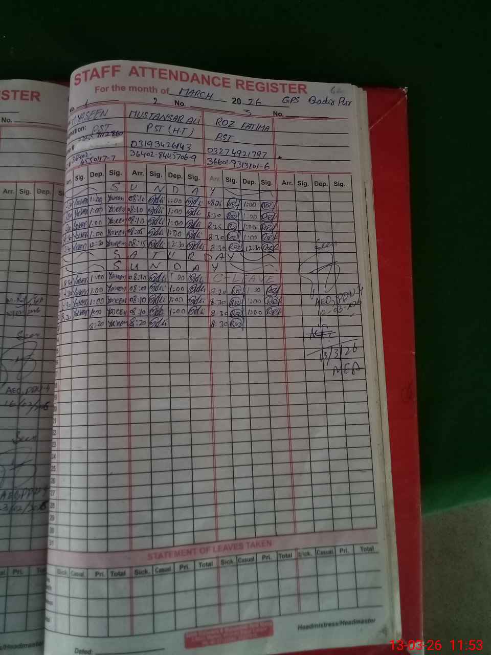 | Name: Mu**** Al**** Designation: (School Headmaster's/Headmistress's) PST Phone/Cell Number: 03**** |