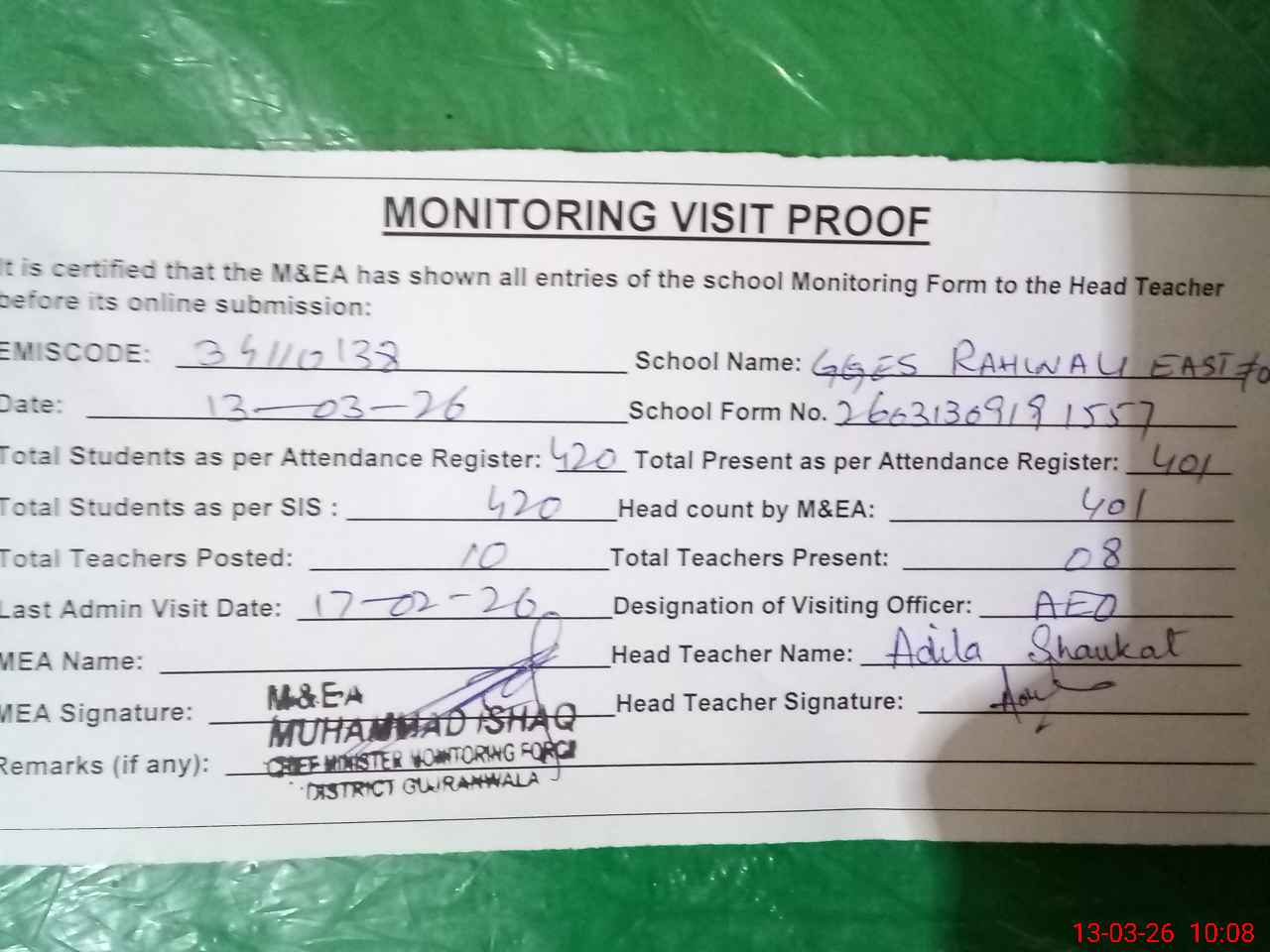 | Attendance Register | Head Teacher | MEA with School | Visit Proof |