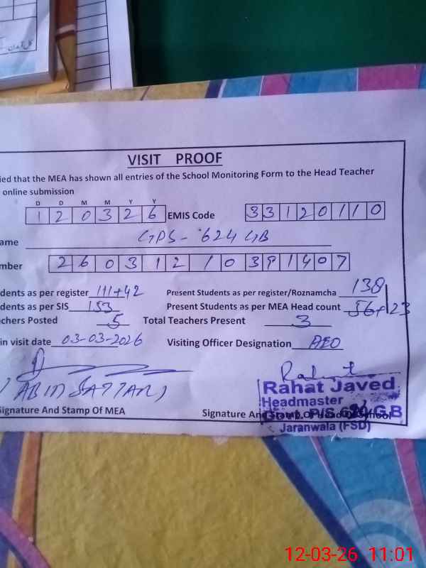 | EMIS Code: 33120110 | Name of School: GPS CHAK 624 GB HARI PUR | |||