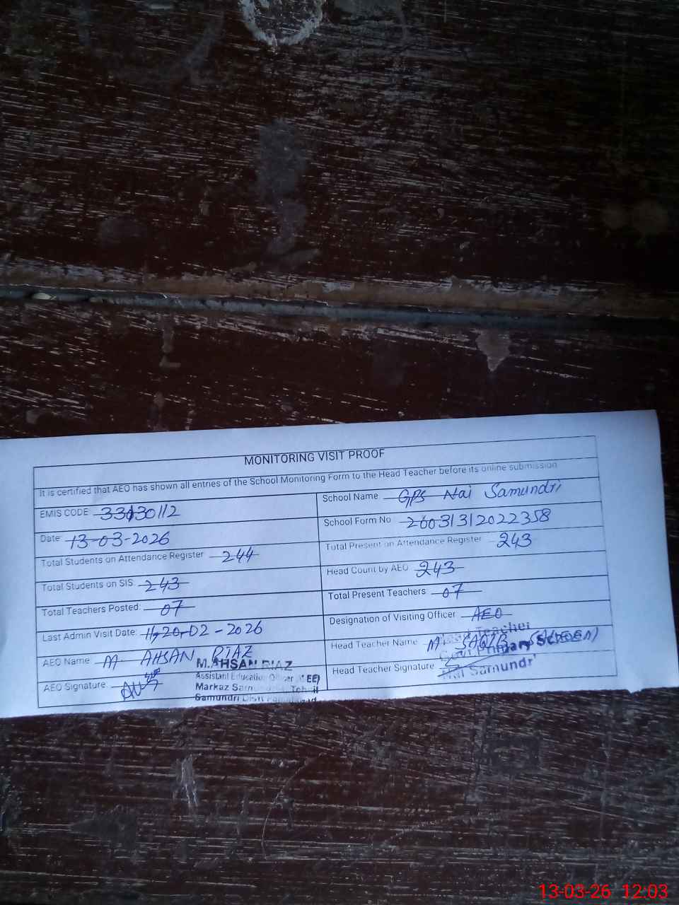 | Attendance Register | Head Teacher | MEA with School | Visit Proof |