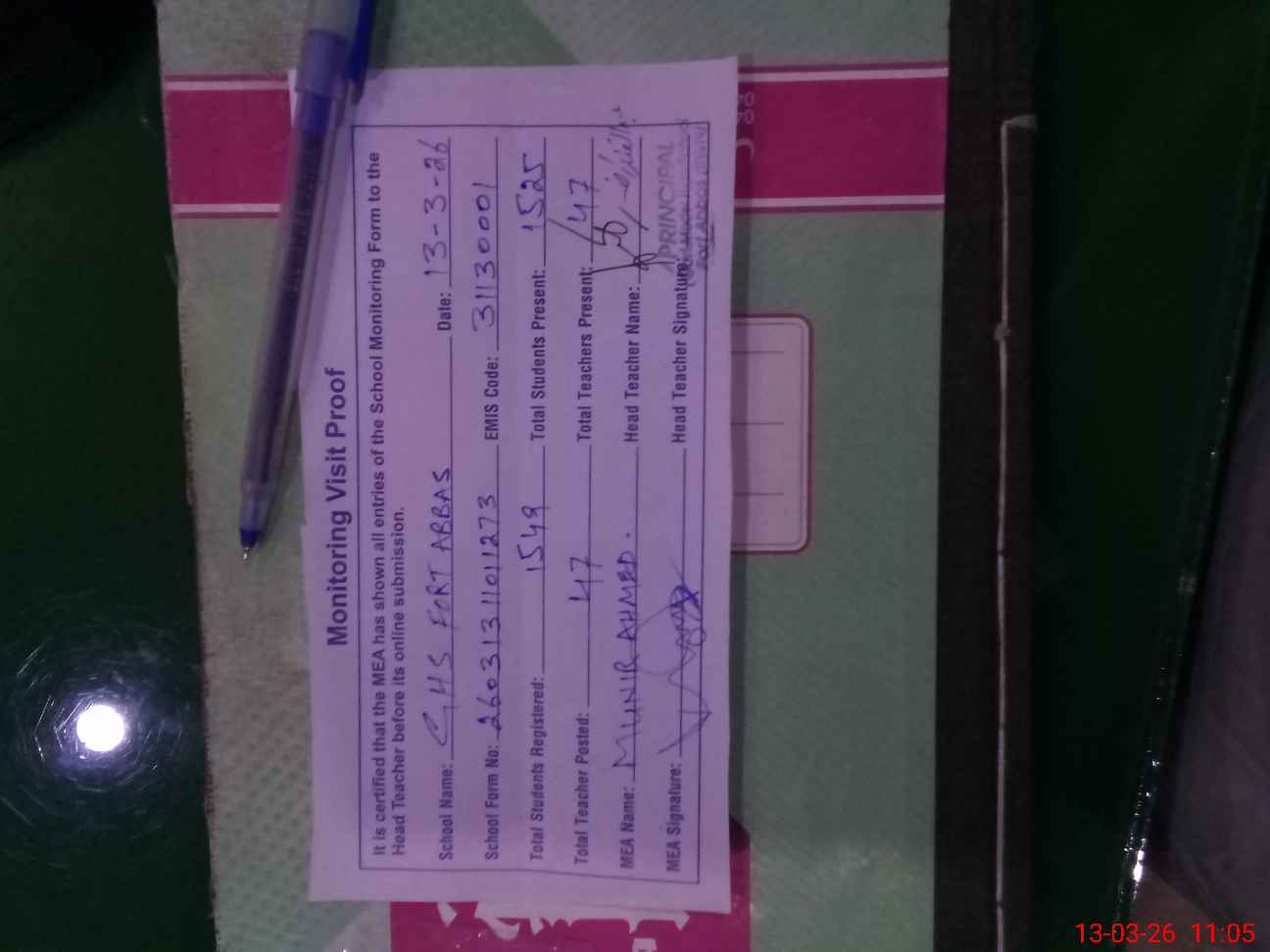 | Attendance Register | Head Teacher | MEA with School | Visit Proof |