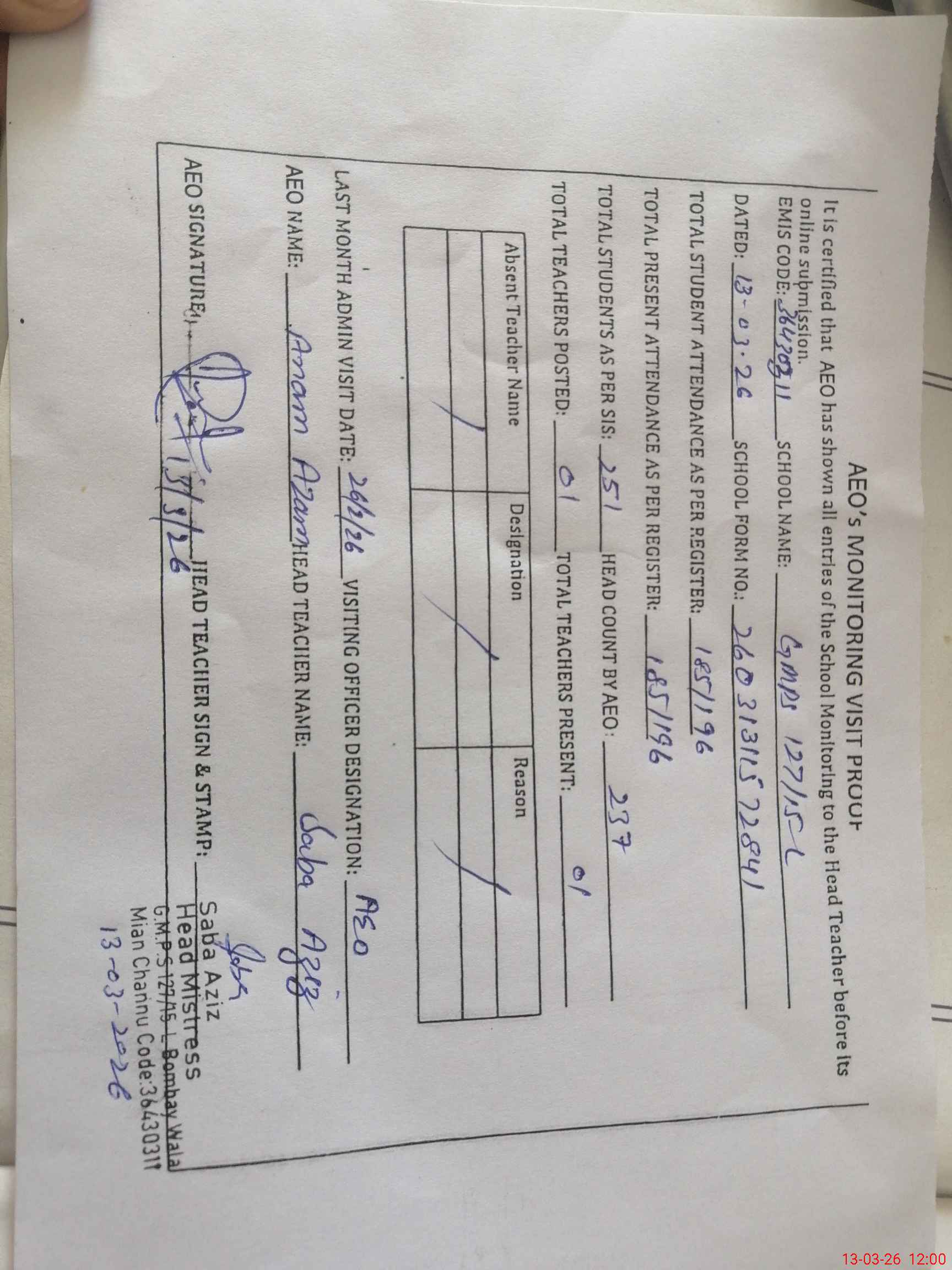 | EMIS Code: 36430311 | Name of School: GMPS 127/15-L BOMBAY WALA, MIAN CHANNU | |||