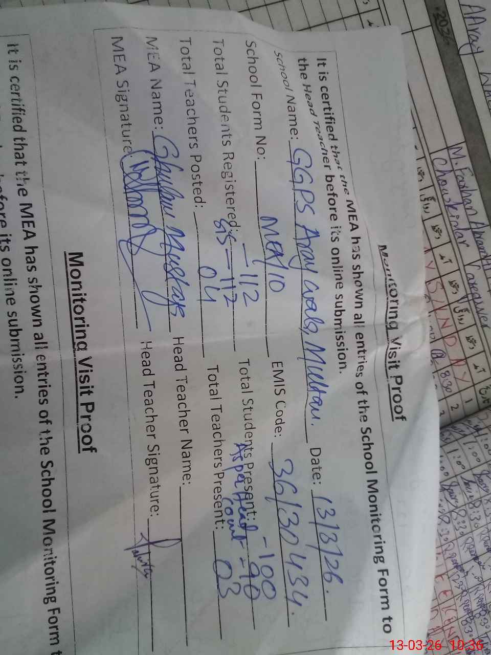 | EMIS Code: 36130434 | Name of School: GGPS AARAY WALA MUZA JHOK LASHAKAR PUR | |||