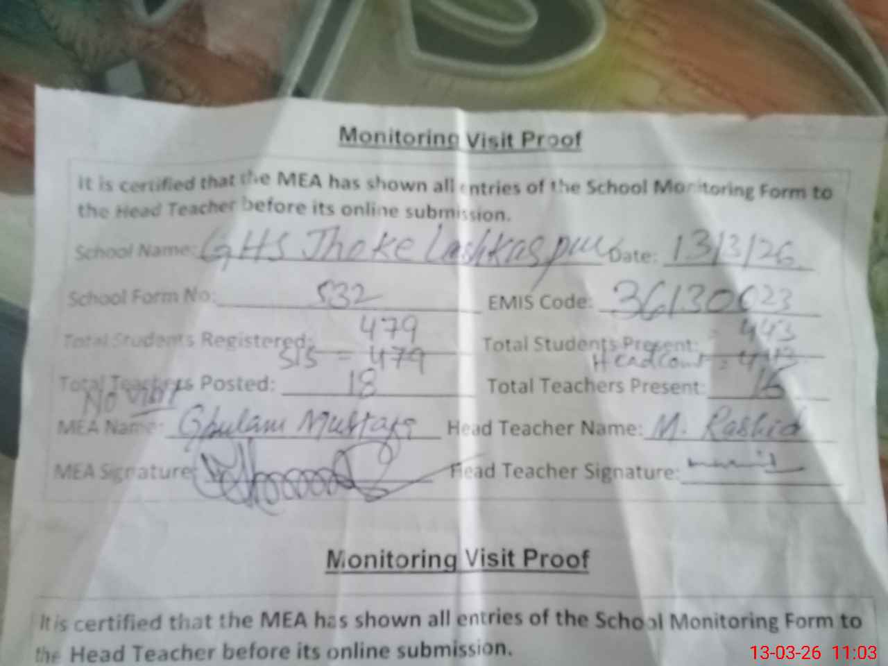 | Attendance Register | Head Teacher | MEA with School | Visit Proof |