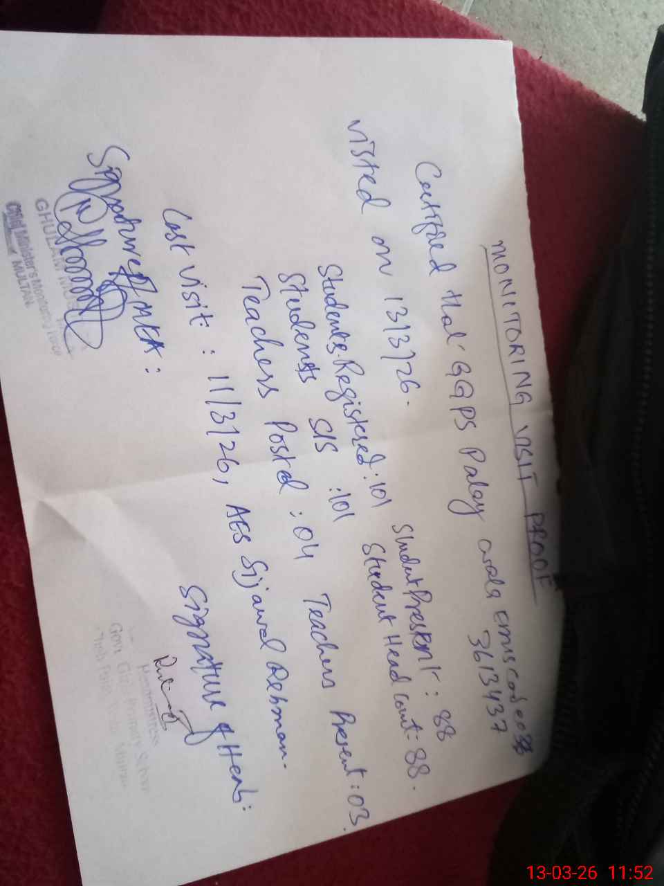| Attendance Register | Head Teacher | MEA with School | Visit Proof |
