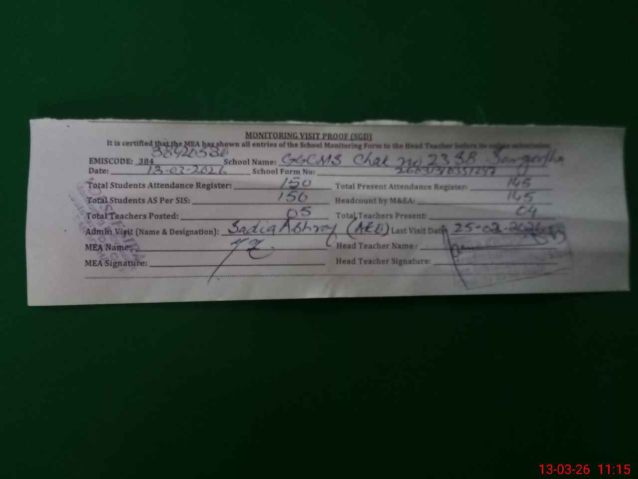 | Attendance Register | Head Teacher | MEA with School | Visit Proof |