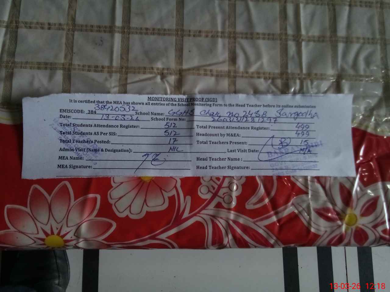 | Attendance Register | Head Teacher | MEA with School | Visit Proof |