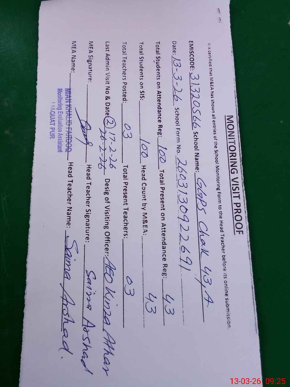 | Attendance Register | Head Teacher | MEA with School | Visit Proof |