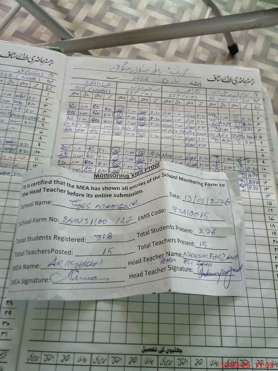 | Attendance Register | Head Teacher | MEA with School | Visit Proof |