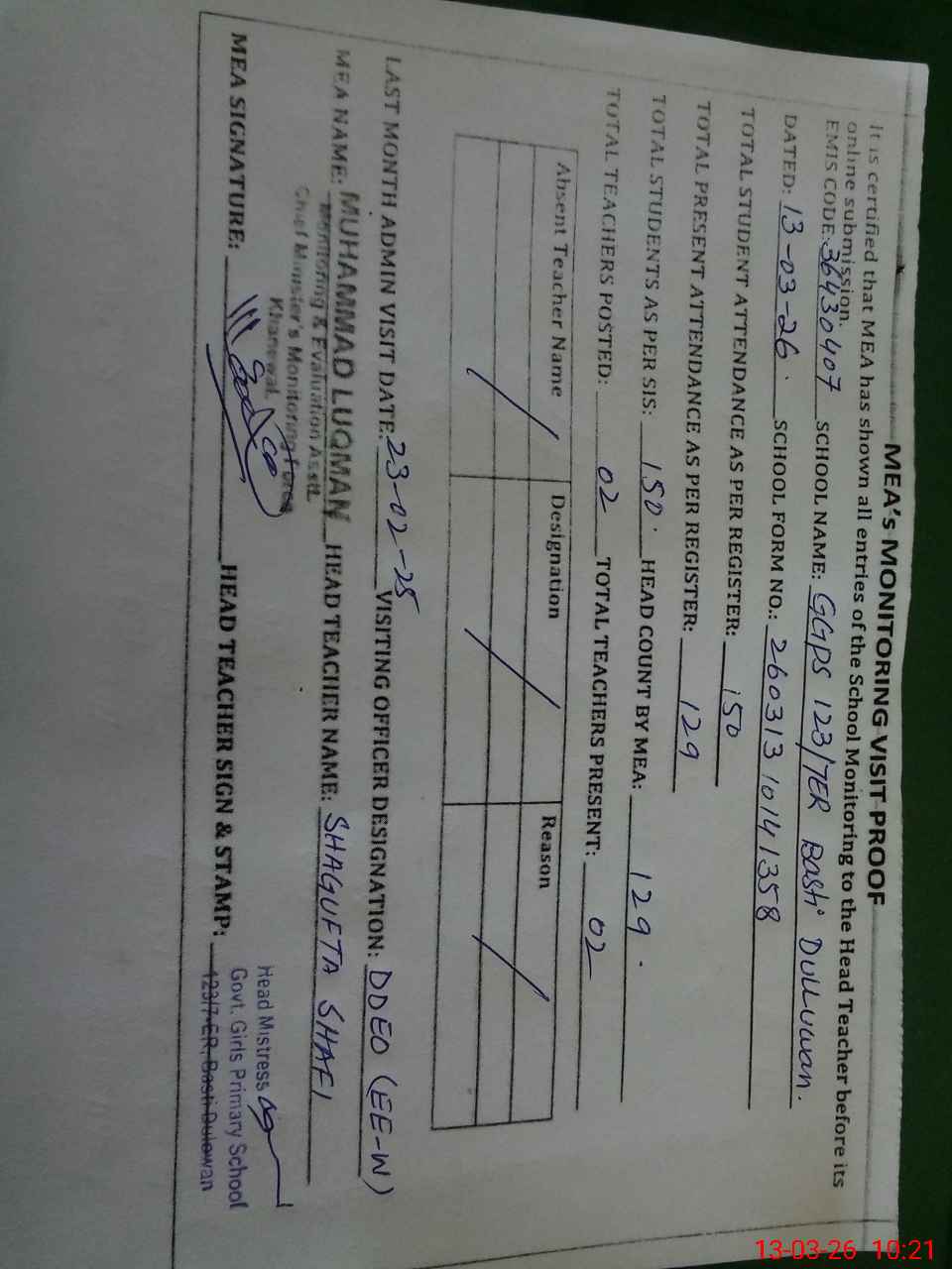| Certified that this School was Inspected by the Undersigned MEA/DMO Today and the Information Stated Above is as Per Record. | |||||