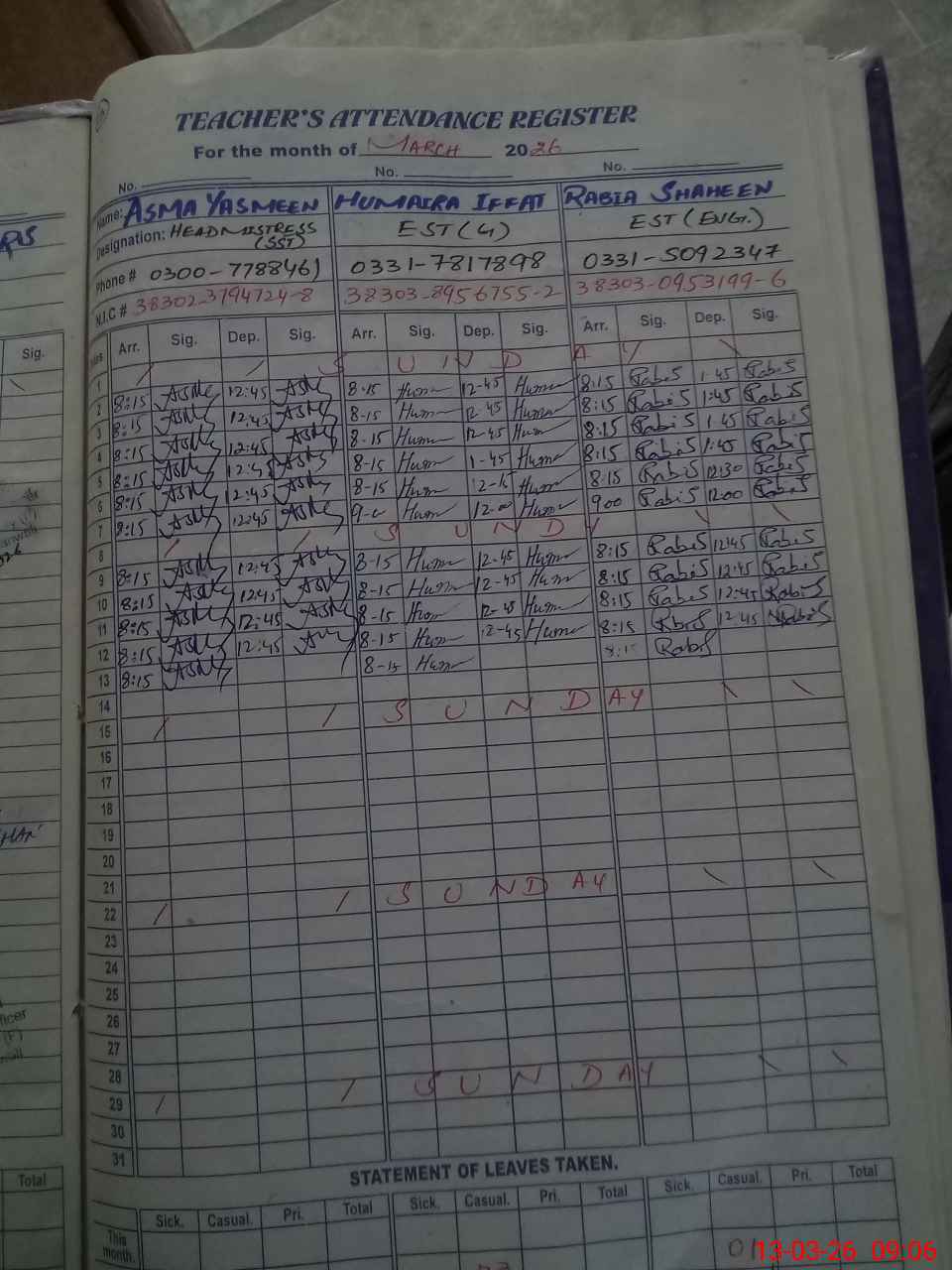 | Name: As**** Ya**** Designation: (School Headmaster's/Headmistress's) SST ( CHM / BIO ) Phone/Cell Number: 03**** |