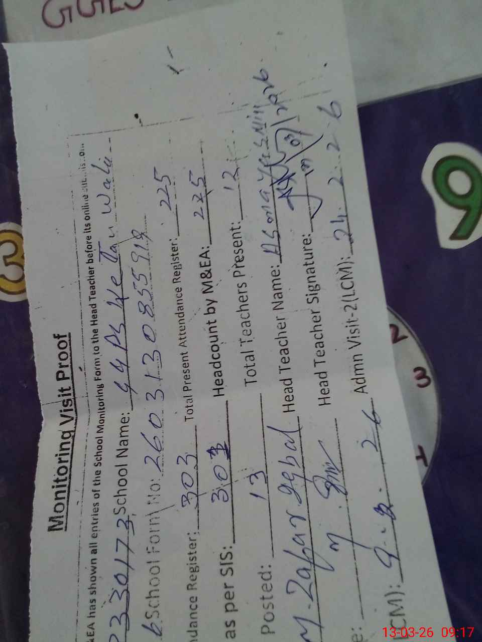 | Attendance Register | Head Teacher | MEA with School | Visit Proof |