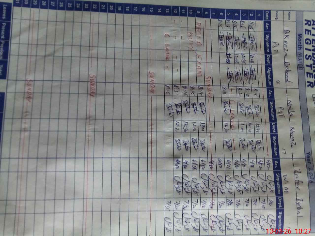 | CNIC | Full Name | Designation | R/C | Absence During Last Calender Month |