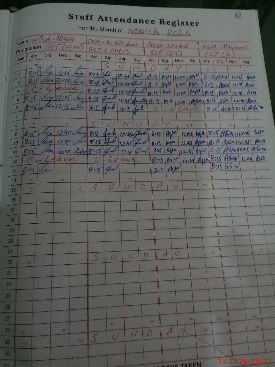 | Leave | Duty | Absent | Maternity | Medical | Ex- Pak |