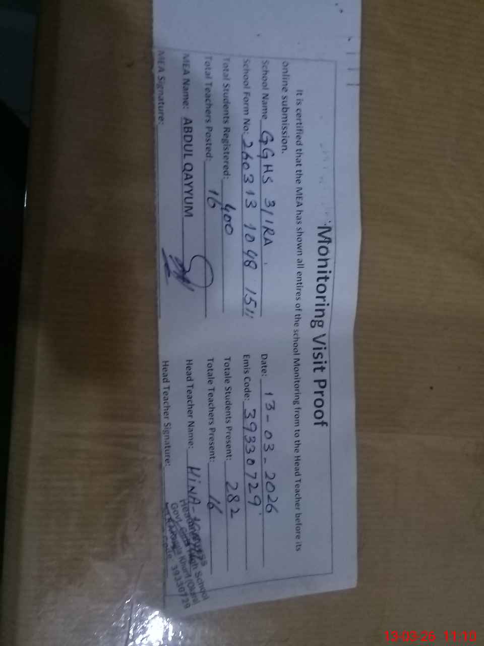 | Attendance Register | Head Teacher | MEA with School | Visit Proof |