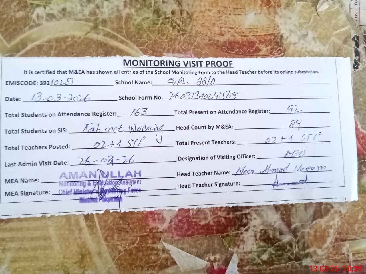 | Attendance Register | Head Teacher | MEA with School | Visit Proof |