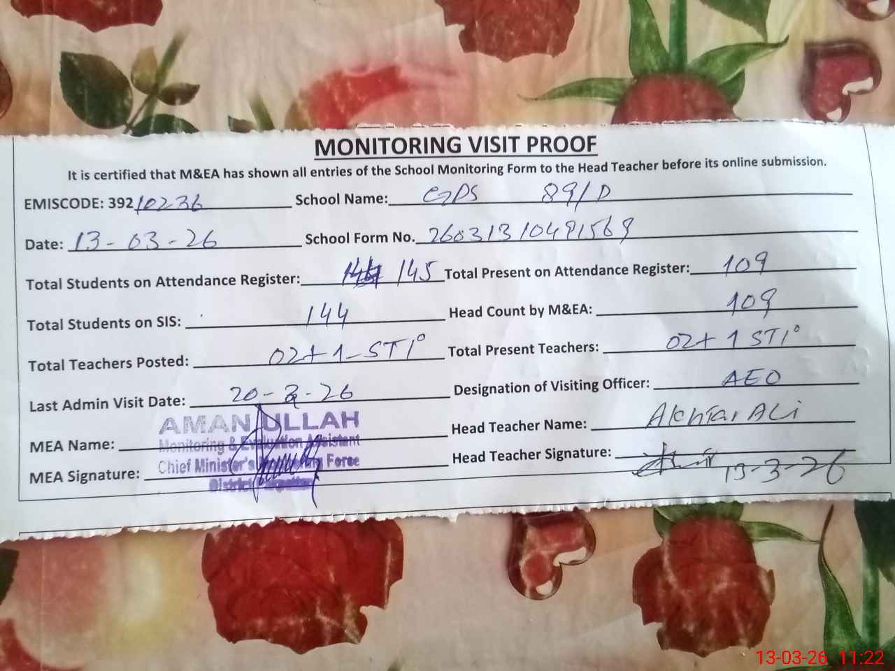 | EMIS Code: 39210236 | Name of School: GPS CHAK NO. 89 /D | |||