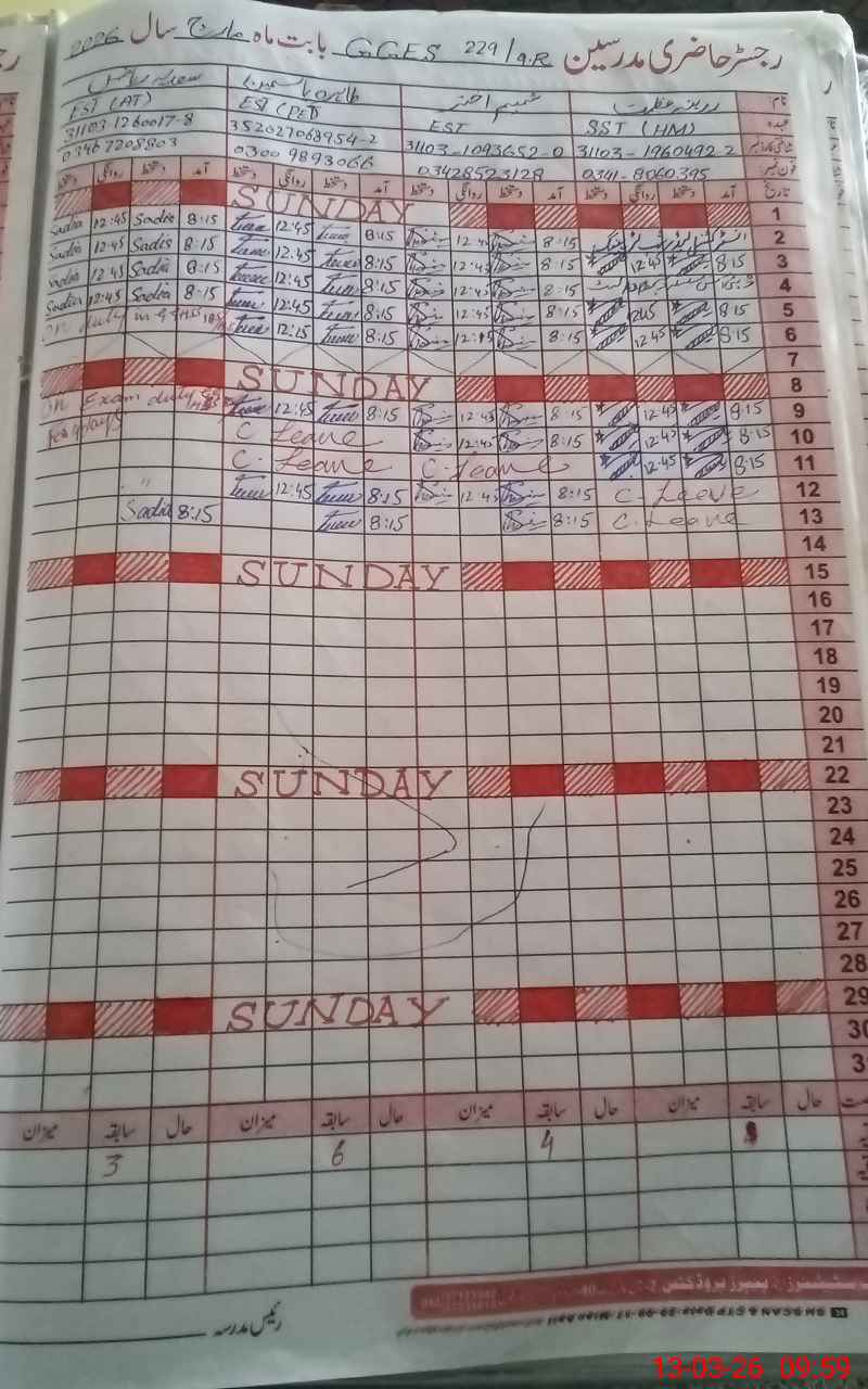 | CNIC | Full Name | Designation | R/C | Absence During Last Calender Month |