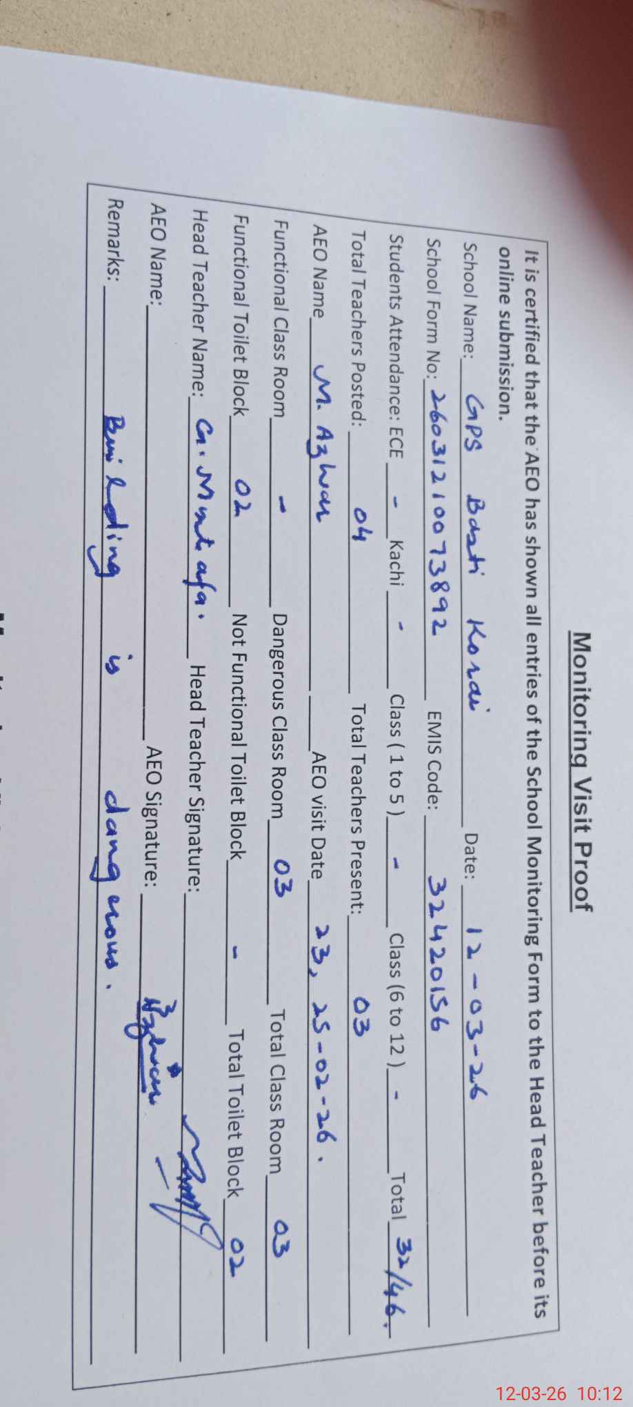 | EMIS Code: 32420156 | Name of School: GPS BASTI KORAI | |||