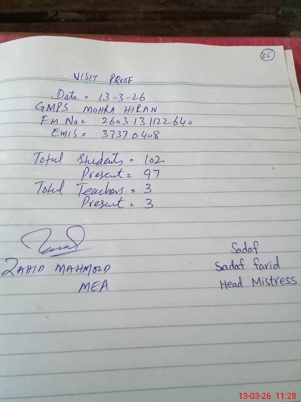 | Attendance Register | Head Teacher | MEA with School | Visit Proof |