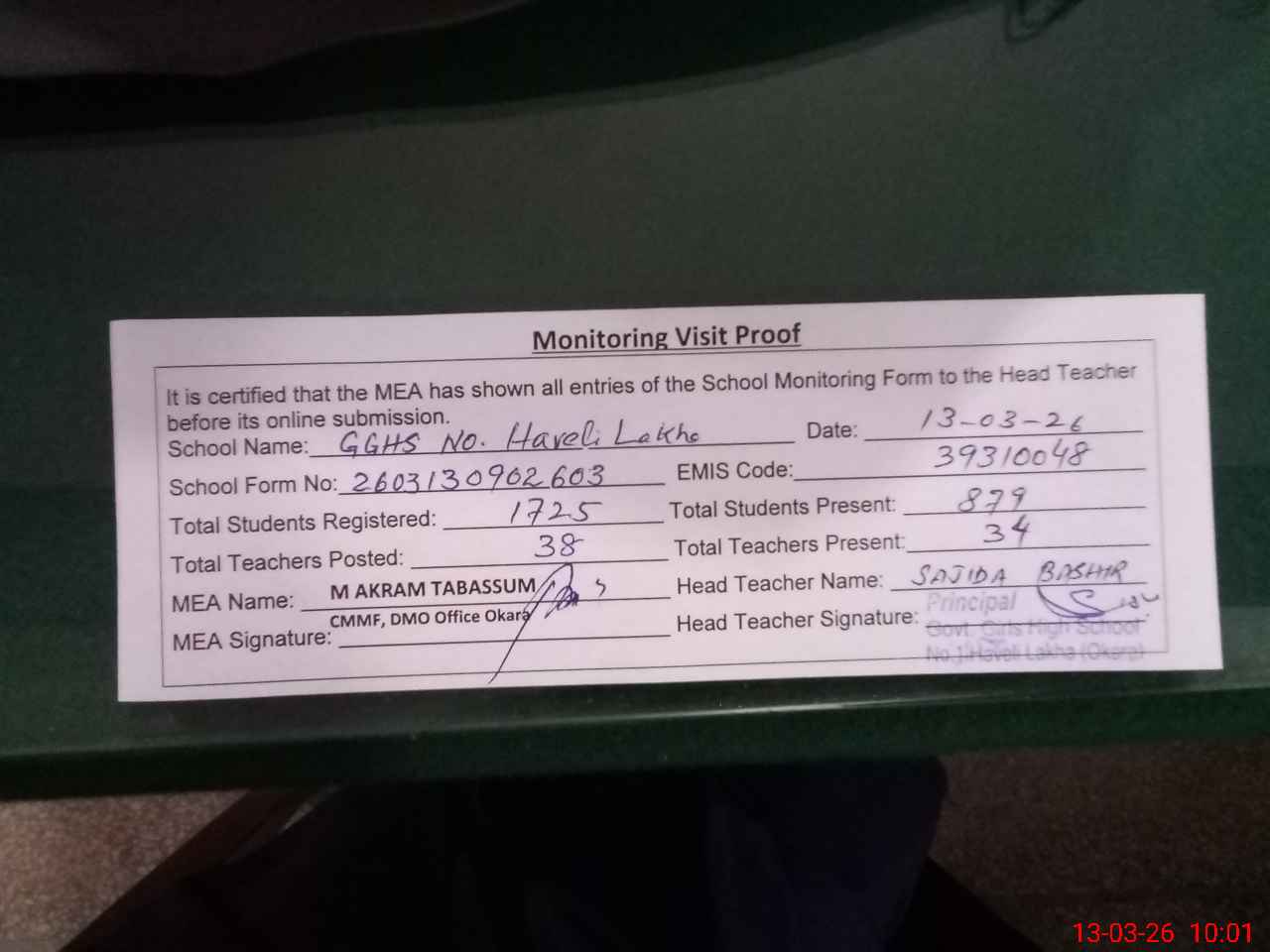 | Certified that this School was Inspected by the Undersigned MEA/DMO Today and the Information Stated Above is as Per Record. | |||||