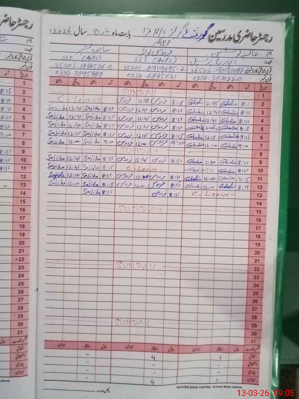 | CNIC | Full Name | Designation | R/C | Absence During Last Calender Month |