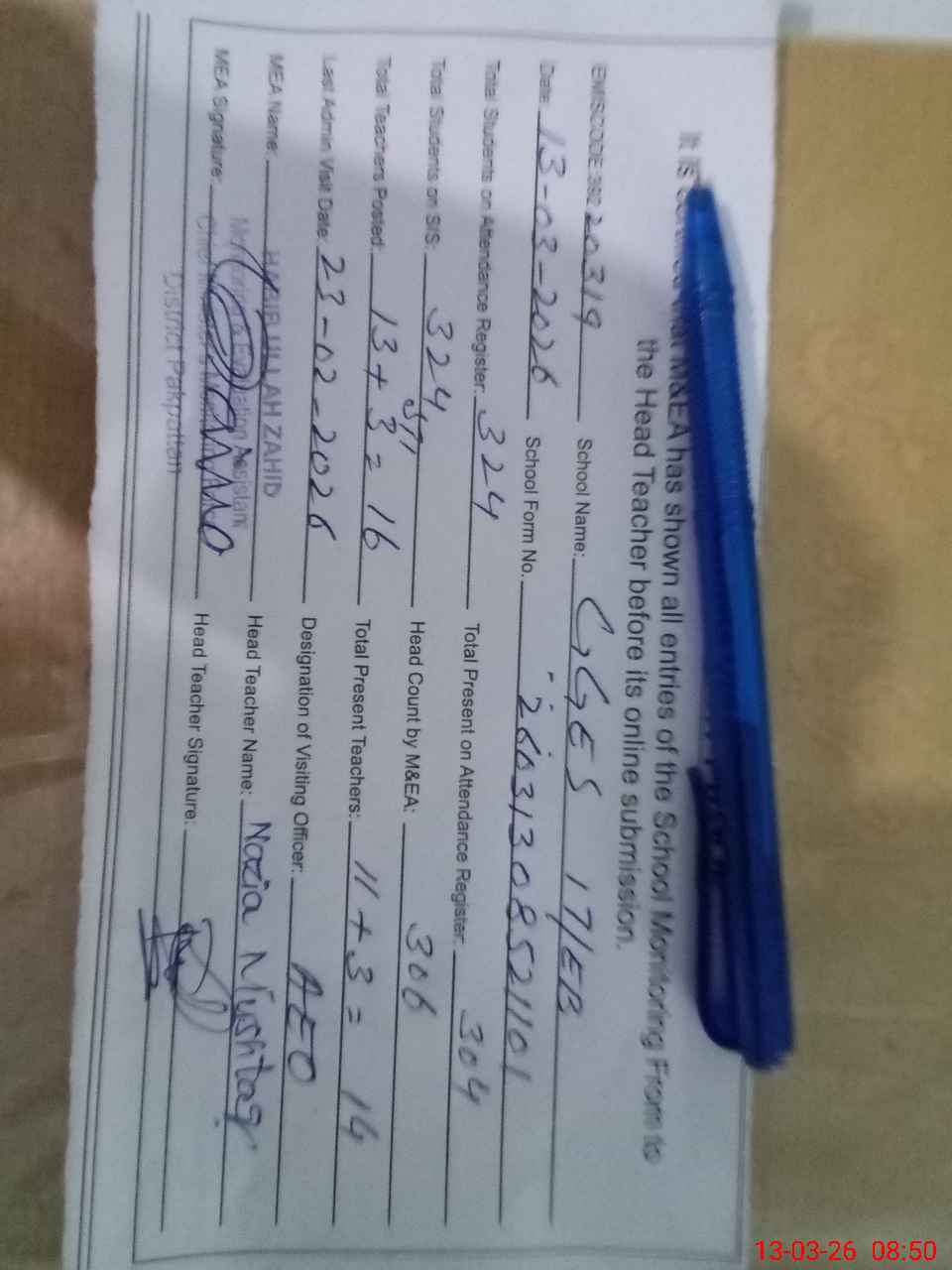 | Remarks (Use Separate Page if Required): NOTE. 1.STI NIMRA SALEEM EST CNIC 3640154807904 2 STI SHAKEELA IQRAR EST CNIC 3640143663098 3 STI IRAM SHEHZADI EST CNIC 3640101663050 ALL ABOVE ARE FOUND PRESENT AT THE TIME OF SCHOOL INSP. | |||||