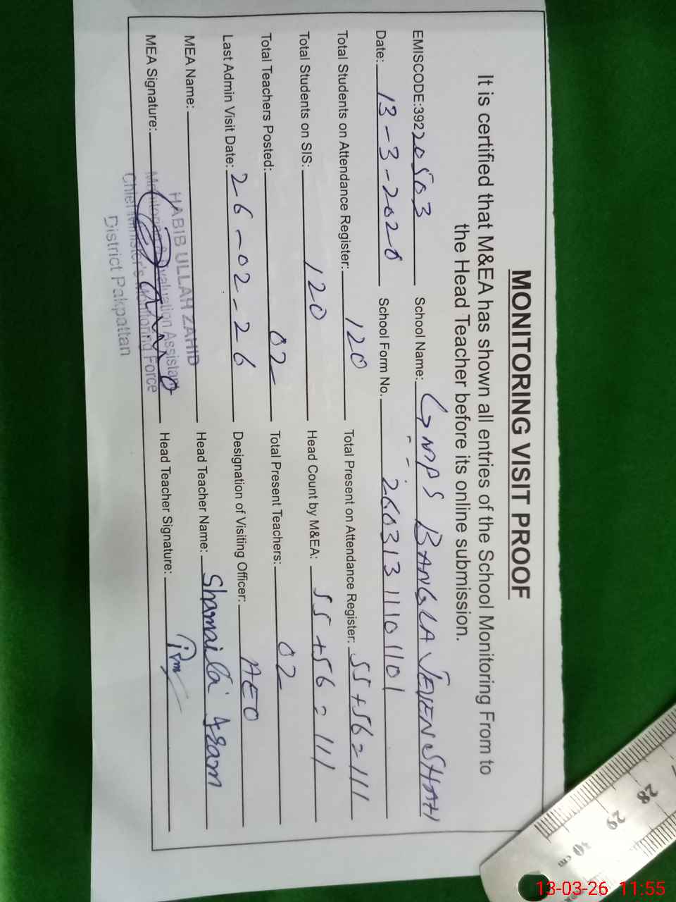 | Certified that this School was Inspected by the Undersigned MEA/DMO Today and the Information Stated Above is as Per Record. | |||||
