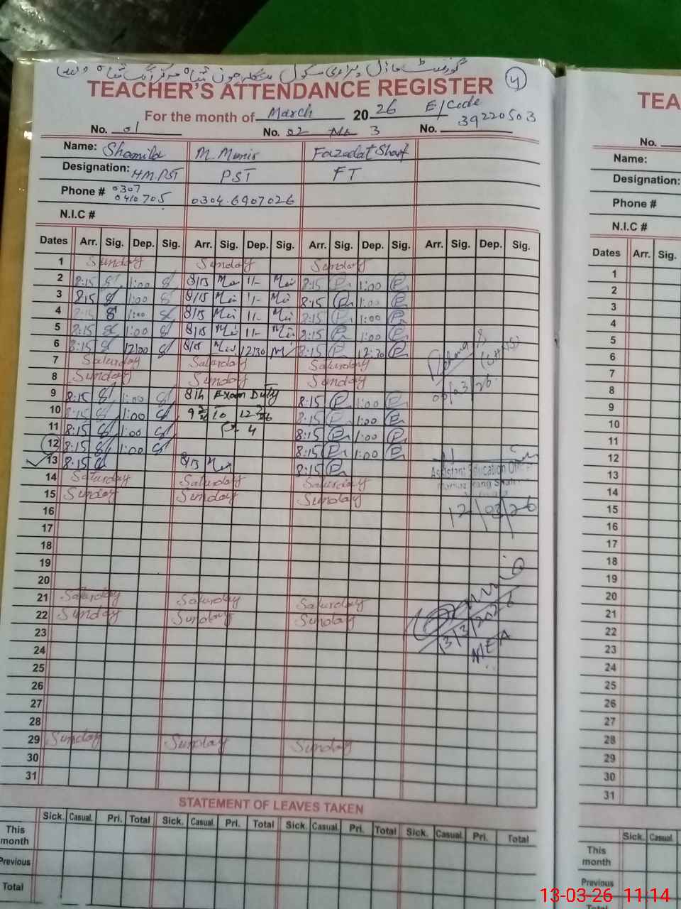 | Name: SH**** IR**** Designation: (School Headmaster's/Headmistress's) PST Phone/Cell Number: 03**** |