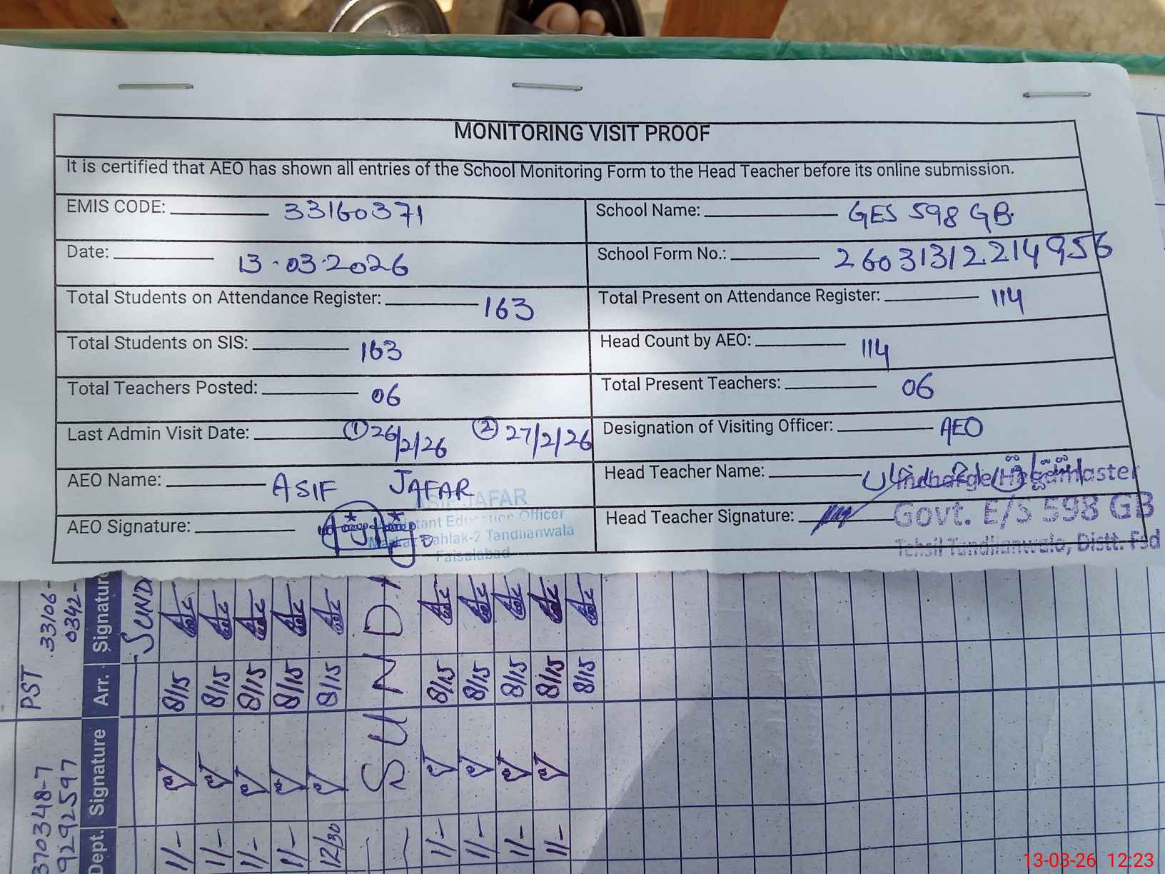 | Attendance Register | Head Teacher | MEA with School | Visit Proof |