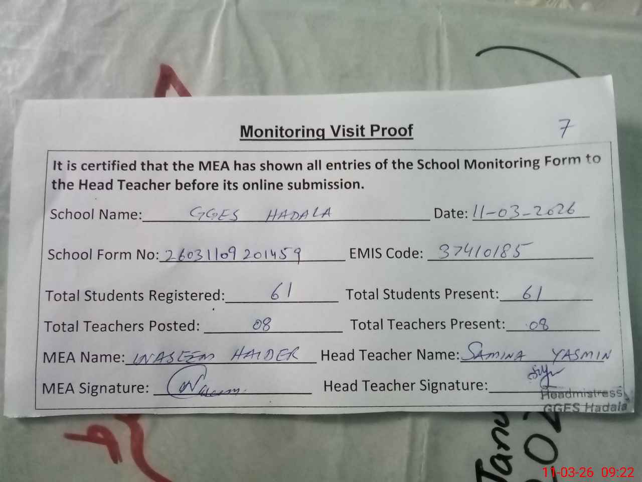 | Attendance Register | Head Teacher | MEA with School | Visit Proof |
