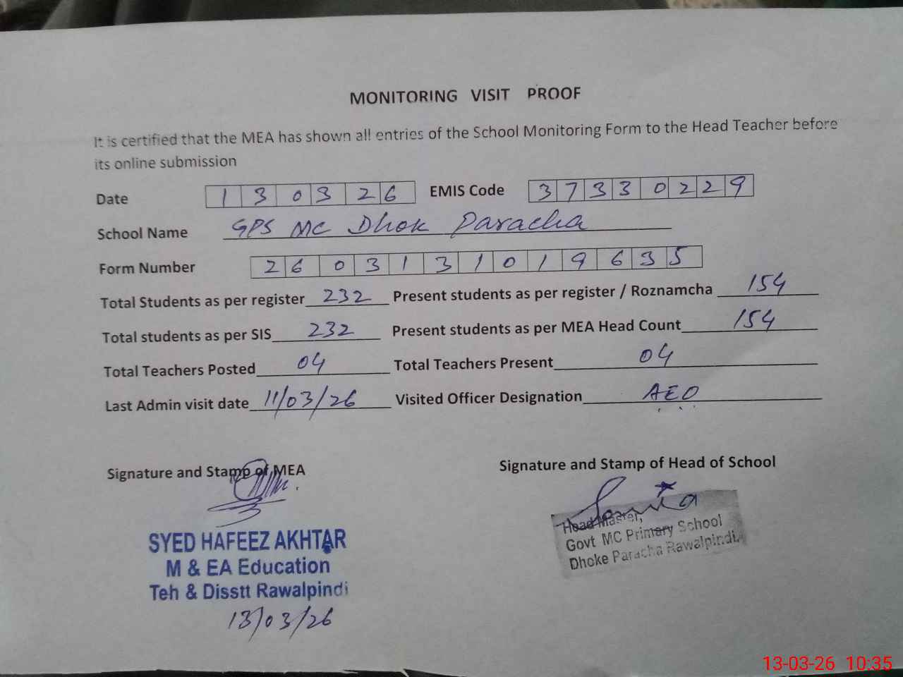 | Attendance Register | Head Teacher | MEA with School | Visit Proof |