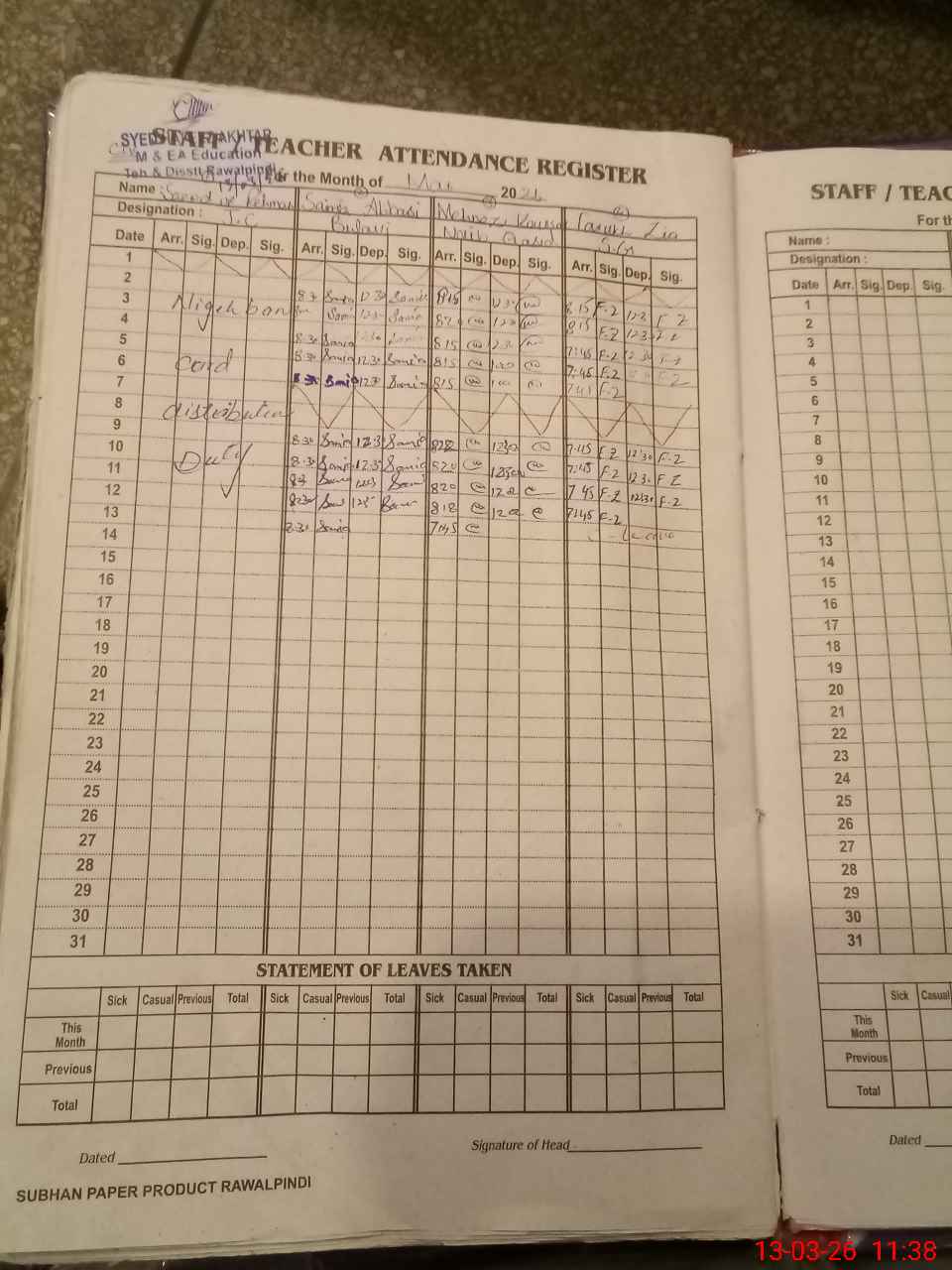 | Leave | Duty | Absent | Maternity | Medical | Ex- Pak |