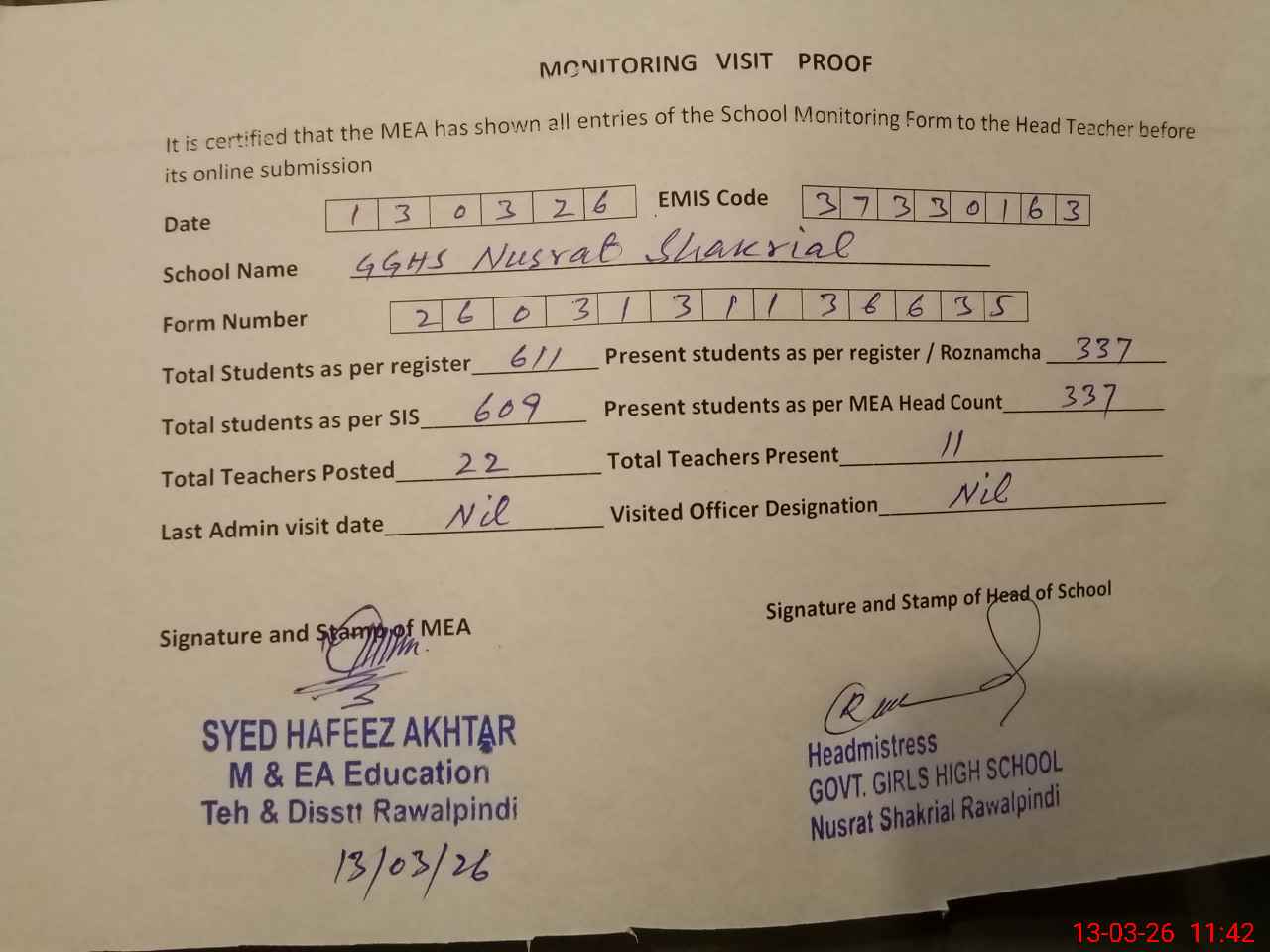 | Attendance Register | Head Teacher | MEA with School | Visit Proof |