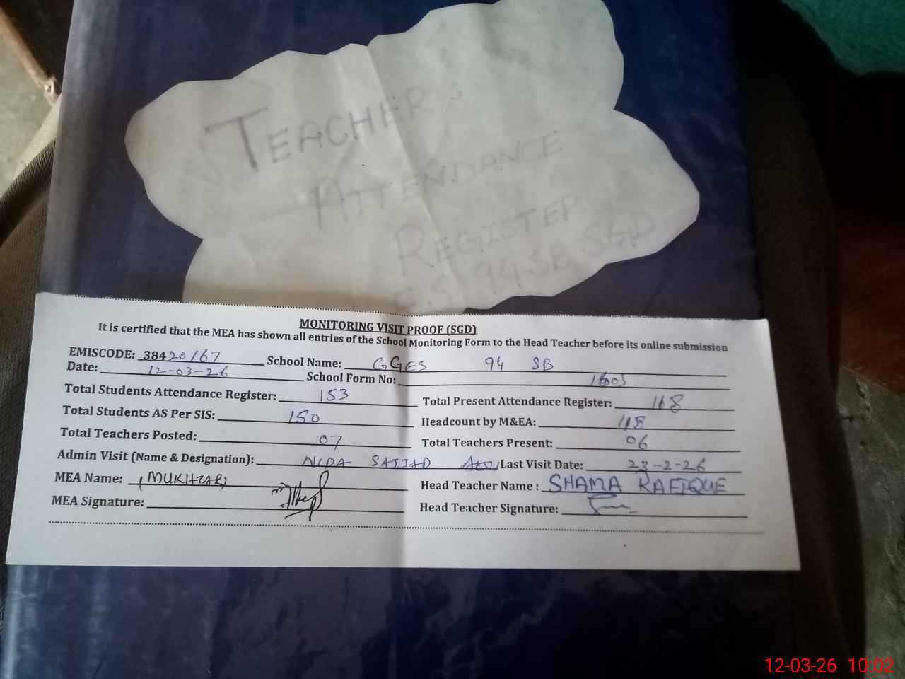 | Attendance Register | Head Teacher | MEA with School | Visit Proof |