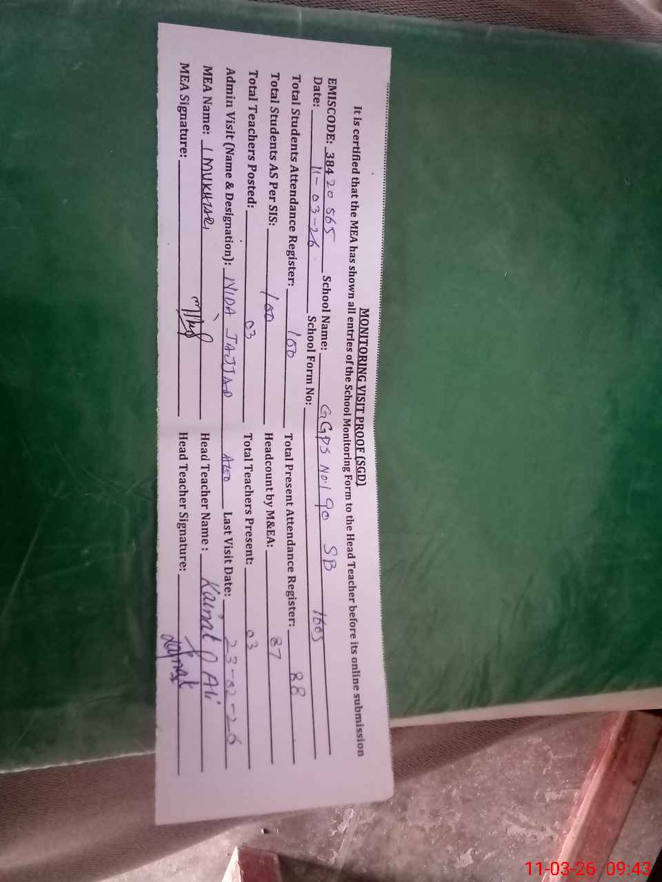 | Attendance Register | Head Teacher | MEA with School | Visit Proof |