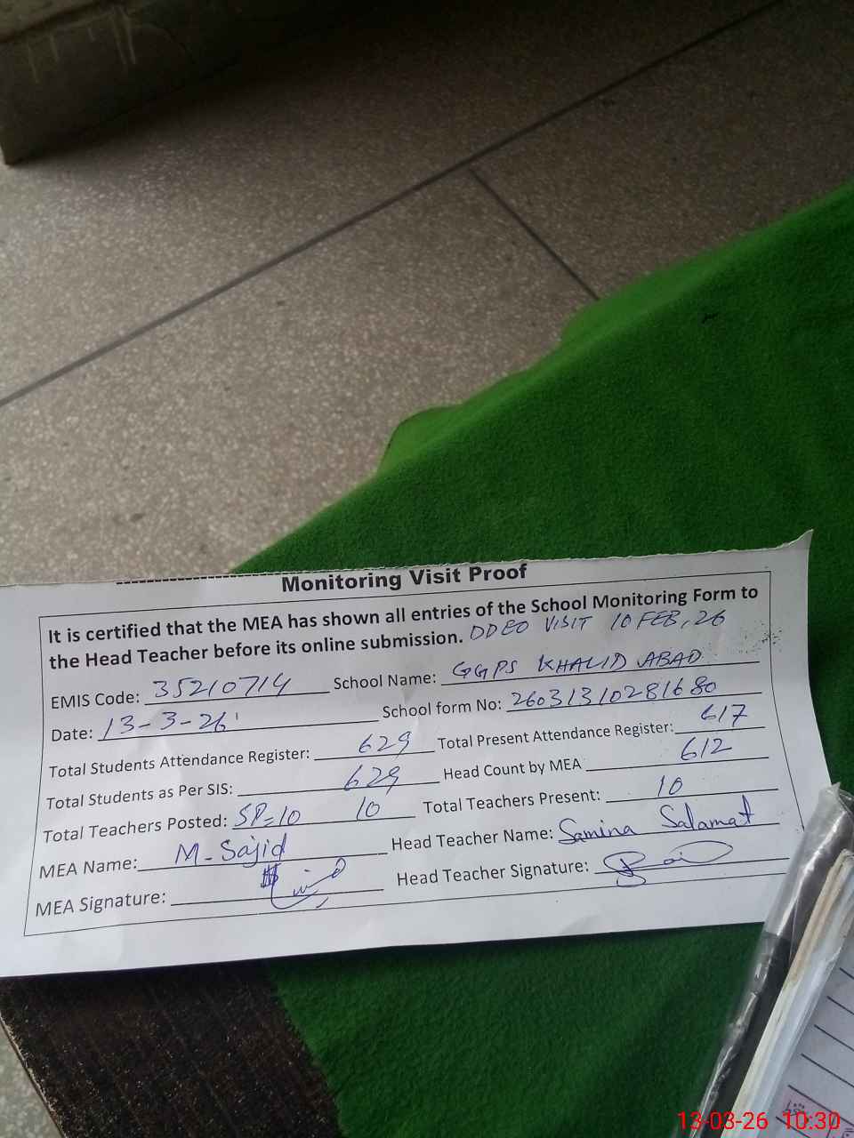 | Attendance Register | Head Teacher | MEA with School | Visit Proof |