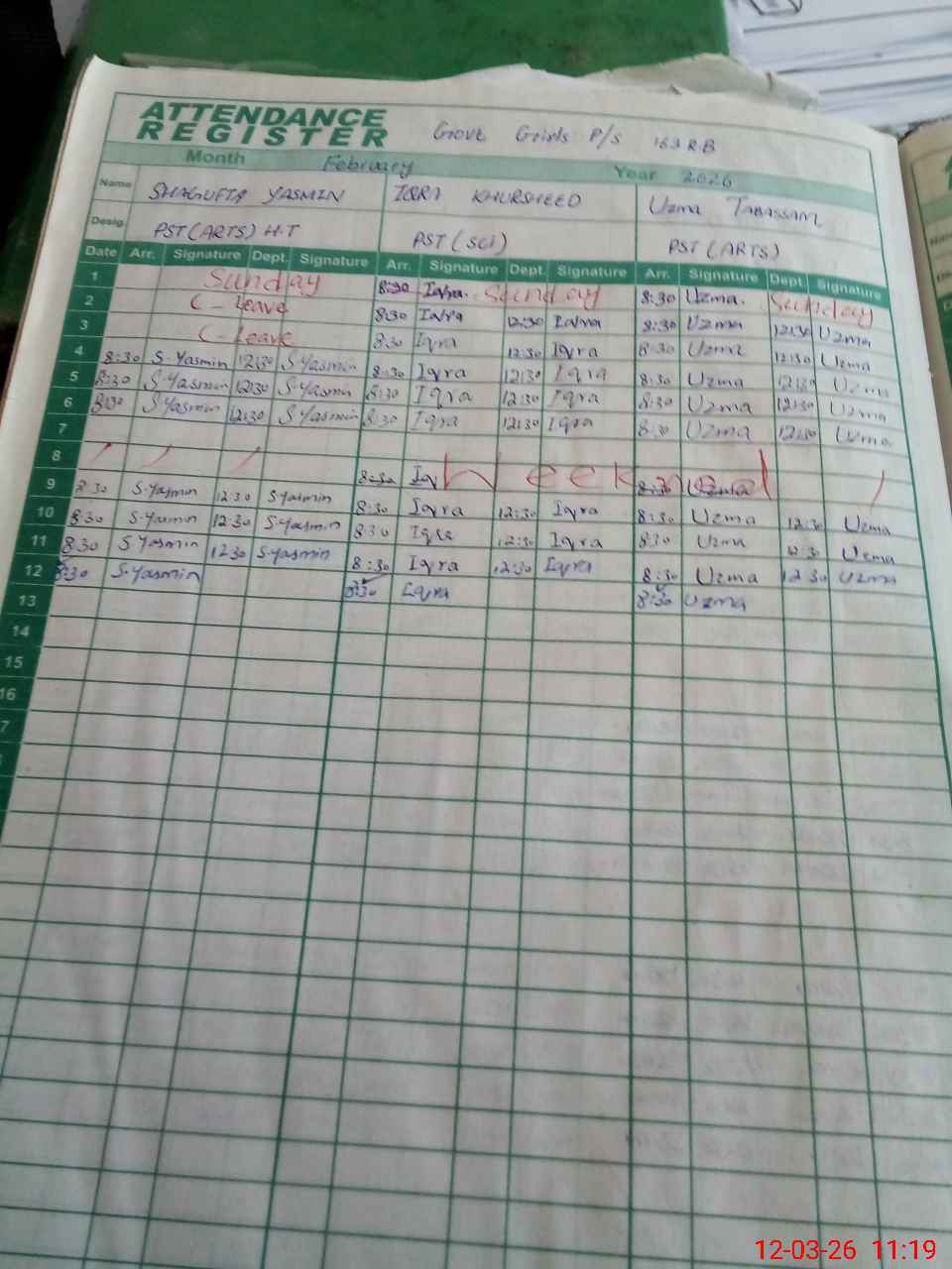 | 33**** | Sh**** Ya**** | PST Arts | Regular | 0 | 0 | 0 | 0 | 0 | 0 | 0 | 0 | 0 | Exam Duty |