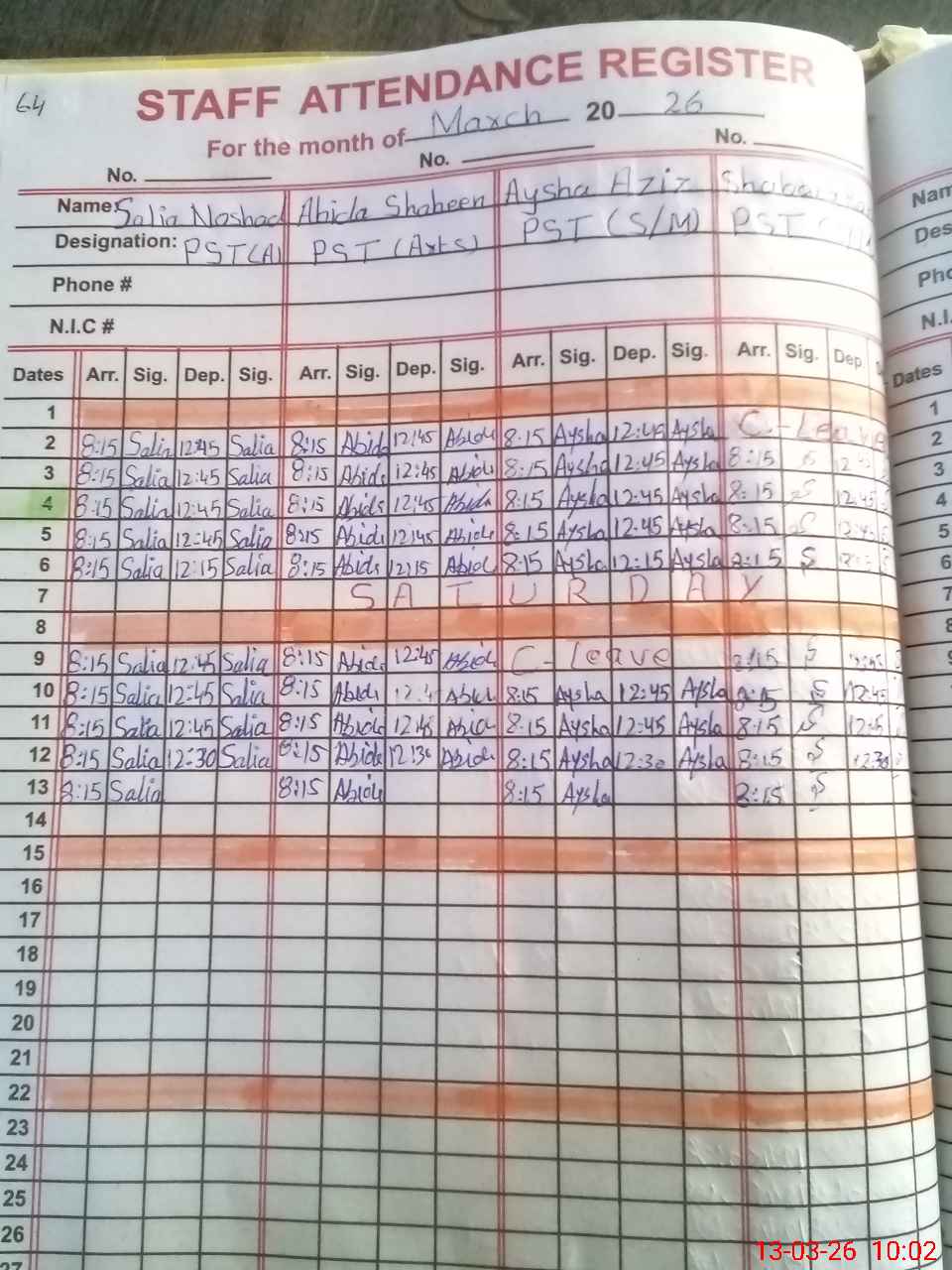| CNIC | Full Name | Designation | R/C | Absence During Last Calender Month |