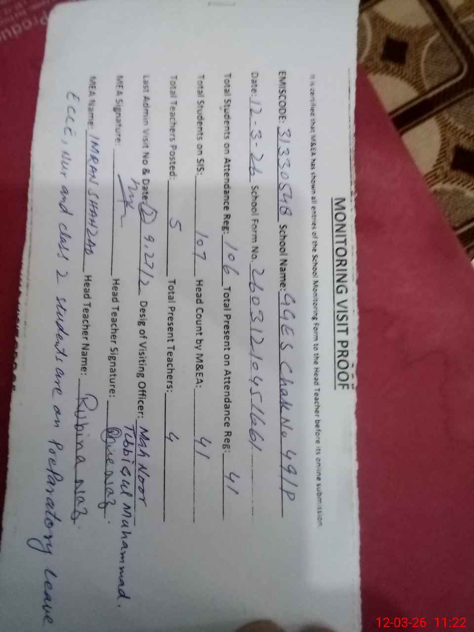 | Attendance Register | Head Teacher | MEA with School | Visit Proof |