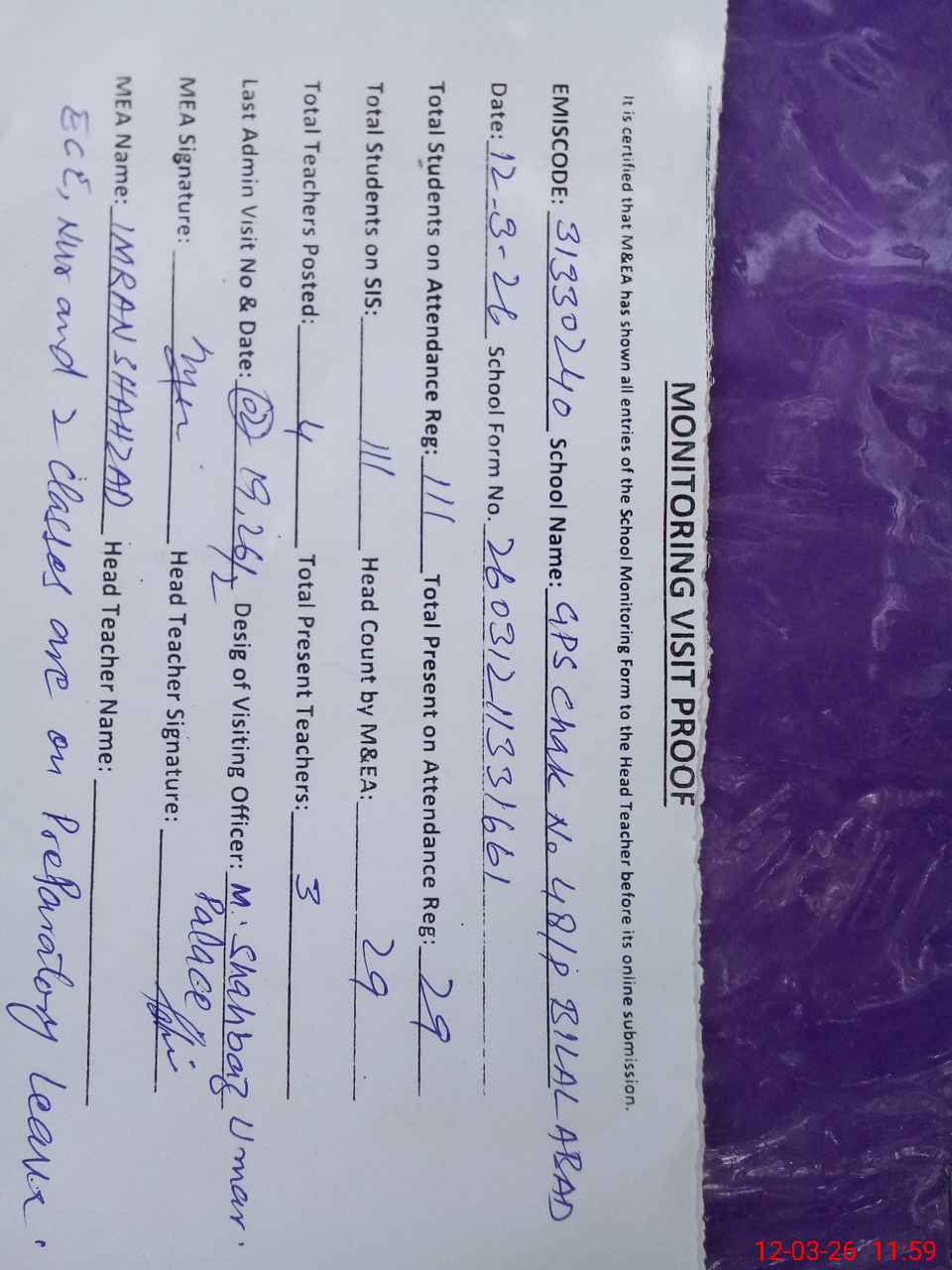 | Attendance Register | Head Teacher | MEA with School | Visit Proof |