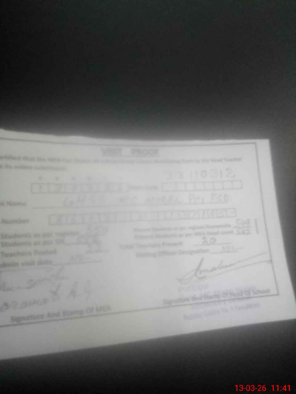 | Attendance Register | Head Teacher | MEA with School | Visit Proof |