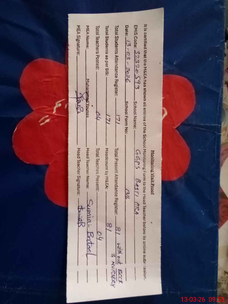 | Attendance Register | Head Teacher | MEA with School | Visit Proof |
