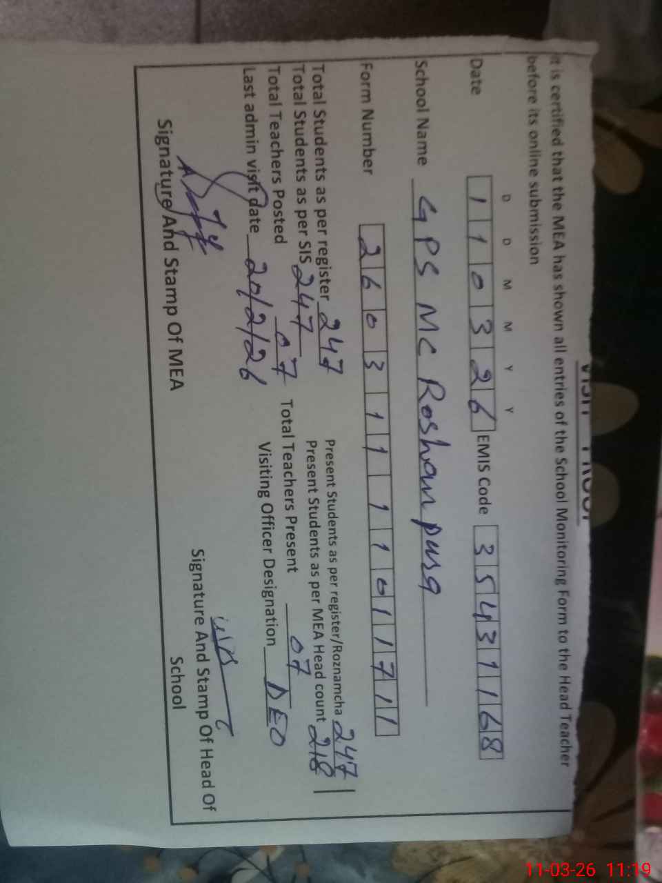 | Certified that this School was Inspected by the Undersigned MEA/DMO Today and the Information Stated Above is as Per Record. | |||||